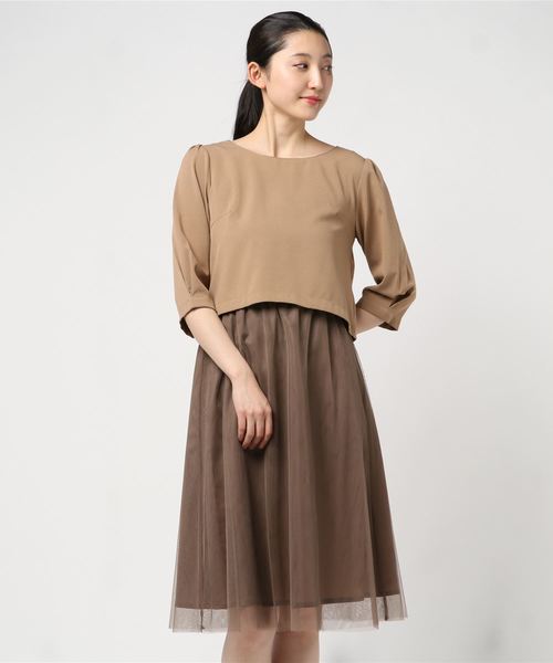 Merlot Plus メルロープリュス の デコルテシースルーチュールスカートワンピース2404 ドレス モカ お呼ばれ ドレス ドレス ファッション